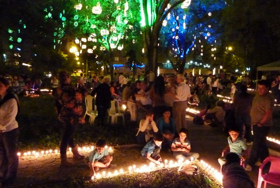 As the sun sets at around 6pm people emerge from their houses and businesses and head to the parks and plazas to light candles. The scene is wonderful; couples, groups of youngsters, grandparents and grandchildren all lighting row upon row of twinkling candles.